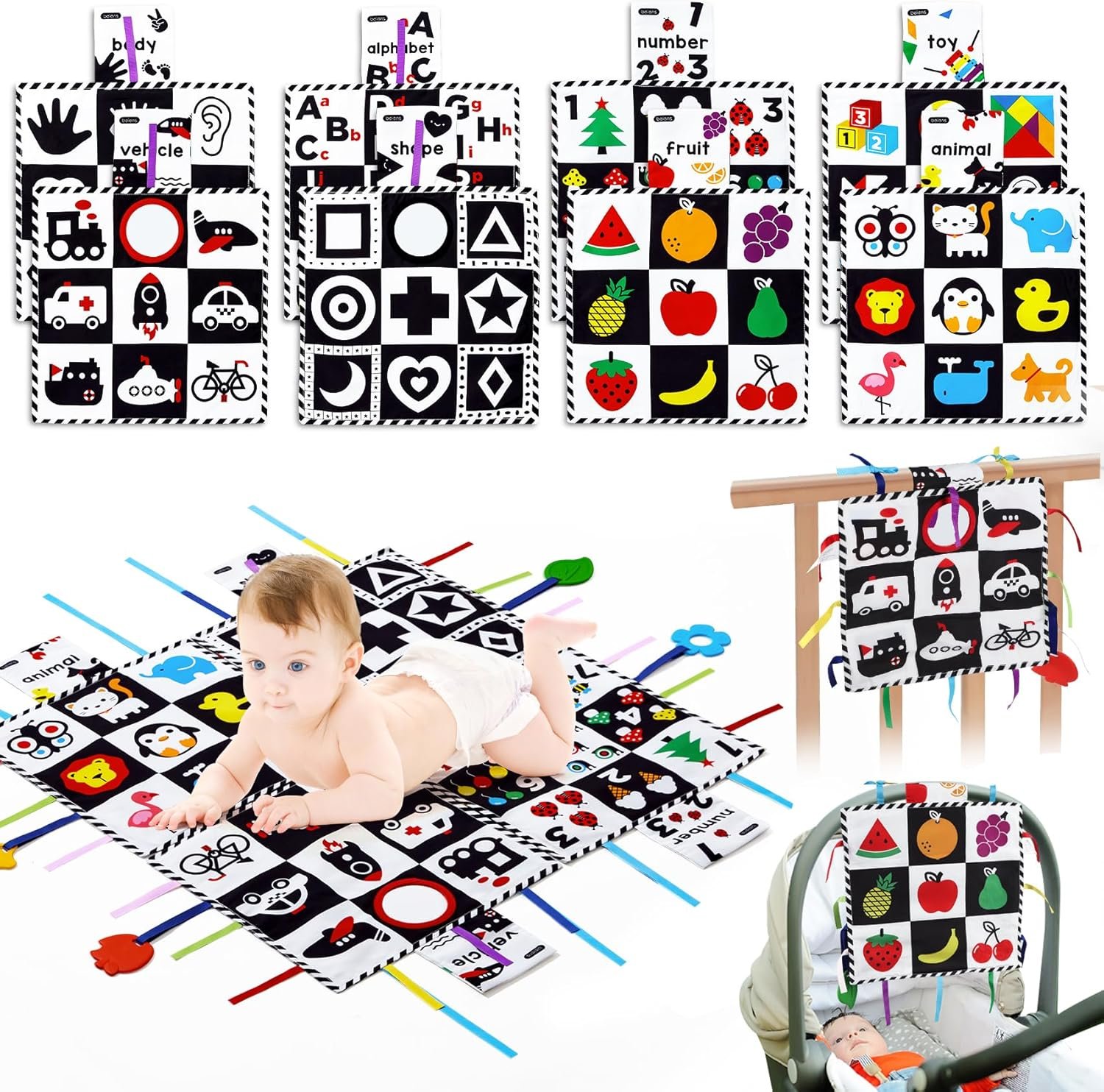 【Great Toys For Tummy Time】The four themes of the tummy time crinkle toys can be BUNDLED together to a large crawl mat, whose size is 23.5″ x 23.5″, allowing the baby to crawl on it and listen to the interesting sounds of this crinkle toy. Crawling on this tummy time mat promotes the development of baby’s muscle. The tummy time mats are made of soft polyester. There are no doubt that they are absolutely safe for your baby thanks to non-toxic, strong stitching and hand washable material.