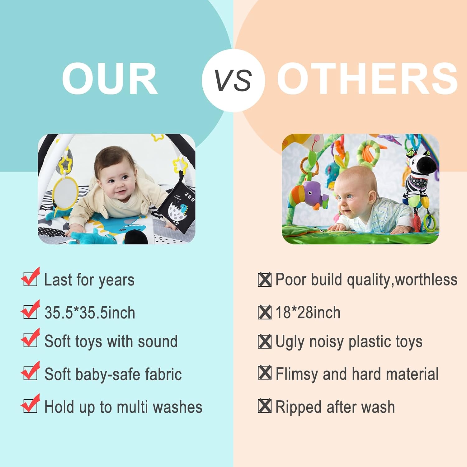 Montessori Sensory Interactive Toys:This baby activity mat is offering hours of playtime made to stimulate a baby’s Sight, Hearing, and Touch, Cognitive and Physical Coordination.5 different texture toys which make different sounds (crinkle fabric,bell, BB etc) included in the package.5 Removable sensory toys can become stroller or car seat toys too. Fully meet the baby’s growth needs.The black and white baby play mat allows babies to focus more on playing and better cultivate their focus.